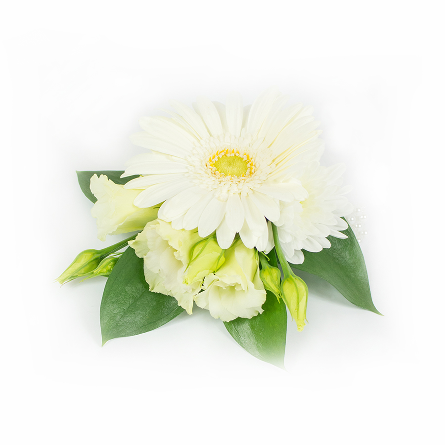Enhance your special day with our stunning pearly white gerbera corsage, a perfect blend of beauty and sophistication.