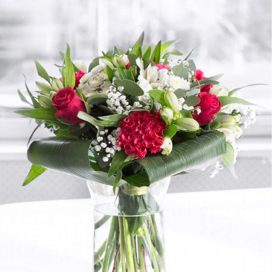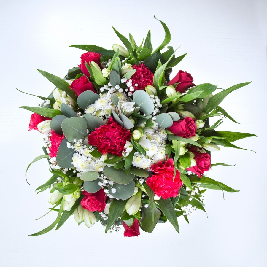 Embrace elegance with our beautifully crafted bouquet. This stunning arrangement showcases vibrant red roses alongside pure white chrysanthemums and delicate gypsophila, creating a harmonious blend of colors and textures.